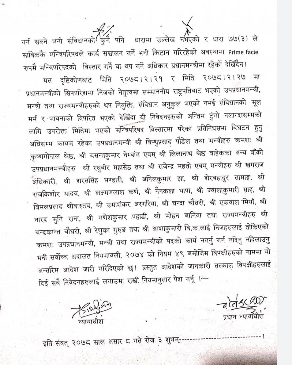 सर्वोच्च अदालतले जसपाका ११ सहित २० मन्त्री पदमुक्त हुने आदेश दिएको छ । काम चलाउ प्रधानमन्त्रीले गरेको मन्त्रिपरिषद् पुनर्गठन अवैधानिक हुने भन्दै सर्वोच्च अदालतमा परेको रिटमा सर्वोच्च प्रधानन्यायाधीश चोलेन्द्र शमशेर जवरा र न्यायाधीश प्रकाश कुमार ढुंगानाको इजलासले सो आदेश दिएको हो ।
