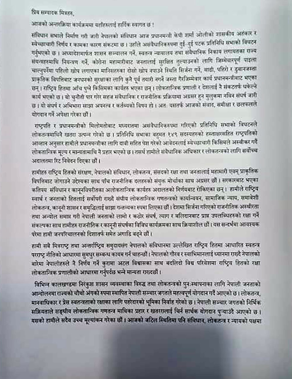 सभापति देउवाले आफूहरु मित्रराष्ट्र तथा अन्तर्राष्ट्रिय मुलुकहरुसँग स्वतन्त्र परराष्ट्र नीतिको आधारमा सम्बन्ध कायम गर्न चाहेको पनि बताए । सभापति देउवाले लोकतन्त्र र संविधानको पक्षमा उभिन पनि सबैलाई आह्वान गरे । उनले भने – ‘राष्ट्रपति र प्रधानमन्त्रीको मिलेमतोबाट मध्यरातमा असंवैधानिक रुपमा गरिएको प्रतिनिधिसभा विघटनले लोकतन्त्र माथि नै खतरा उत्पन्न गरेको छ । प्रतिनिधि सभाका बहुमत १४९ जनाको हस्ताक्षरसहित राष्ट्रपतिको आह्वानअनुसार हामीले प्रधानमन्त्रीका लागि दाबी गर्‍यौं । स्वेच्छाचारी किसिमले अस्वीकार गर्दै लोकतान्त्रिक मूल्य र मान्यतामाथि नै प्रहार भएको छ । तसर्थ हामीले लोकतन्त्रका लगि सर्वोच्च अदालतमा निवेदन दिएका छौं । हामीहरु राष्ट्रिय हितको संरक्षण, नेपालको संविधान, लोकतन्त्रको रक्षा र जनतालाई महामारीबाट बचाउने उद्देश्यसाथ पाँच राजनीतिक दलको संयुक्त मोर्चाका साथ अग्रसर छौं । हामी सबै मित्रराष्ट्र, अन्तर्राष्ट्रिय समुदायसँग नेपालको संविधानमा उल्लेखित राष्ट्रिय हितमा आधारित स्वतन्त्र परराष्ट्र नीतिको आधारमा सुमधुर सम्बन्ध कायम गर्न चाहन्छौं । निरंकुशताविरुद्ध लोकतन्त्रको पक्षमा उठौं, सबै किसिमका षड्यन्त्र चिर्दै संविधान रक्षामा जुटौं ।’
