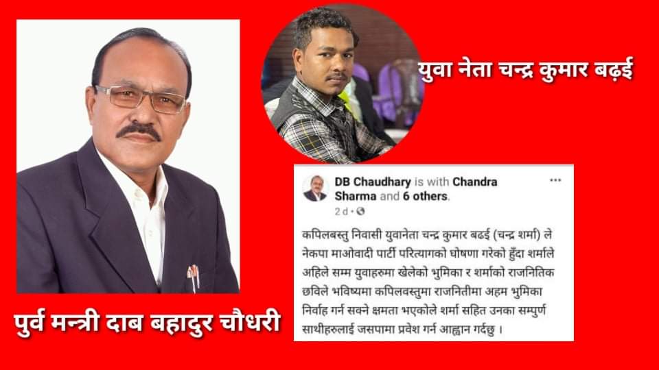 कपिलबस्तु निवासी युवानेता चन्द्र कुमार बढई (चन्द्र शर्मा) ले नेकपा माअोवादी पार्टी परित्यागको घोषणा गरेको हुँदा शर्माले अहिले सम्म युवाहरुमा खेलेको भुमिका र शर्माको राजनितिक छविले भविष्यमा कपिलवस्तुमा राजनितीमा अहम भुमिका निर्वाह गर्न सक्ने क्षमता भएकोले शर्मा सहित उनका सम्पुर्ण साथीहरुलाई जसपामा प्रवेश गर्न अाह्वान गर्दछु ।