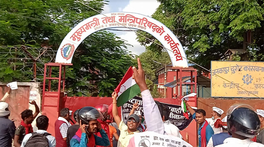 १८ असोज, जनकपुरधाम । सीके राउत नेतृत्वको जनमत पार्टीले प्रदेश २ को मुख्यमन्त्री तथा मन्त्रिपरिषद कार्यालय अगाडि प्रदर्शन गरेको छ ।