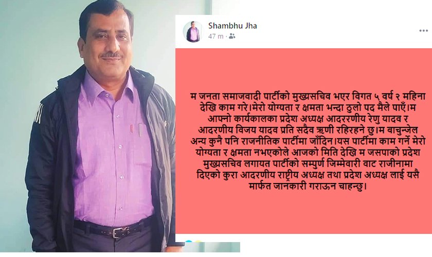 सामाजिक सञ्जालमा शम्भु झाले लेखेका छन्, ‘म जनता समाजवादी पार्टीको मुख्यसचिव भएर विगत ५ वर्ष २ महिना देखि काम गरेँ । मेरो योग्यता र क्षमताभन्दा ठुलो पद मैले पाएँ । म आफ्नो कार्यकालका प्रदेश अध्यक्ष आदरणीय रेणु यादव र आदरणीय विजय यादवप्रति सदैव ऋणी रहिरहने छु । म बाँचुन्जेल अन्य कुनै पनि राजनीतिक पार्टीमा जादिनँ । यस पार्टीमा काम गर्ने मेरो योग्यता र क्षमता नभएकोले आजको मितिदेखि म जसपाको प्रदेश मुख्यसचिव लगायत पार्टीको सम्पूर्ण जिम्मेवारीबाट राजीनामा दिएको कुरा आदरणीय राष्ट्रिय अध्यक्ष तथा प्रदेश अध्यक्षलाई यसैमार्फत जानकारी गराउन चाहन्छु ।’