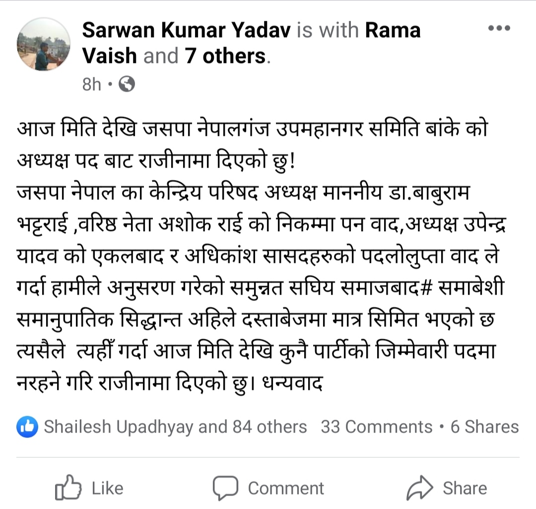 अधिकांश सांसदहरुको पदलोलुप्तावाद ले गर्दा हामीले अनुसरण गरेको समुन्नत संघिय समाजबाद, समाबेशी समानुपातिक सिद्धान्त अहिले दस्ताबेजमा मात्र सिमित भएको गुनासाे आफ्नोे फेसबुक पेजमार्फत पाेखेका छन । उनले पार्टीकाे कुनैपनि पदमा नरहनेसमेत उल्लेख गरि राजिनामा गरेका हुन ।
