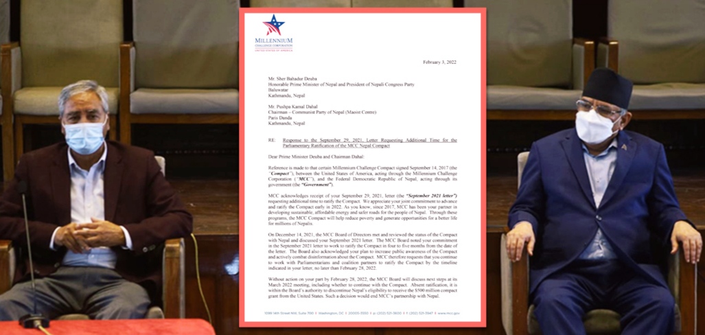 एमसीसी बोर्डका कार्यवाहक मुख्य कार्यकारी अधिकृत मोहमद बहले बिहीबार प्रधानमन्त्री देउवा र प्रचण्डलाई सम्बोधन गर्दै जवाफी ताकेता पत्र पठाएका हुन् । पत्रमा अमेरिकाले एमसीसी संसद्बाट पारित गर्नका लागि आगामी फेब्रुअरी २८ अर्थात् फागुन १६ सम्मको ‘डेडलाइन’ समेत तोकिदिएकोे छ । सो अवधिसम्म सरकारलाई सांसद तथा सत्तारुढ दलसँग छलफल गरेर एमसीसी पारित गर्न एमसीसीले पत्रमा दबावको शैलीमा आग्रह गरेको छ ।
