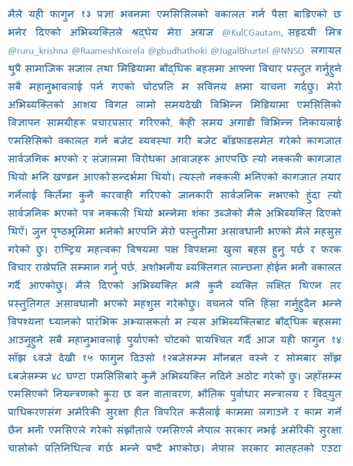 एमसीसीलाई लिएर पैसा बाँडिएको अभिव्यक्ति दिने पूर्वराजदूतले माफी मागे कपिलवस्तु टाइम्स ४ वर्ष अगाडि सेयर गर्नुहोस काठमाडौँ। पूर्वराजदूत लिलामणि पौडेलले एमसीसीको वकालत गर्न पैसा बाँडिएको भन्दै दिएको अभिव्यक्तिलाई लिएर आत्मलोचना गर्दै क्षमा मागेका छन् । नेपाल सरकारका पूर्वमुख्यसचिवसमेत रहेका पौडेलले शनिबार ट्वीटर गर्दै क्षमायाचना मागेका हुन् । Facebook Comments Box