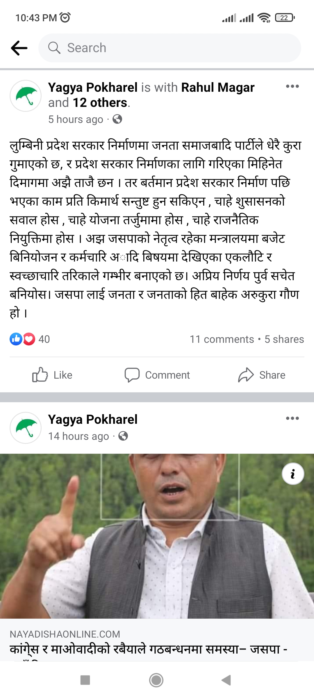 आफ्नाे फेसबुक पेजमा लेख्दै उनले ” लुम्बिनी प्रदेश सरकार निर्माणमा जनता समाजबादि पार्टीले धेरै कुरा गुमाएकाे छ र प्रदेश सरकार निर्माणका लागि गरिएका मिहिनेत दिमागमा अझै ताजै छन । तर बर्तमान प्रदेश सरकार निर्माण पछि भएका काम प्रति सन्तुष्ट हुन सकिएन , चाहे शुसासनकाे सवाल हाेस , चाहे याेजना तर्जुमामा हाेस , चाहे राजनैतिक नियुक्तिमा हाेस । अझ जसपाकाे नेतृत्व रहेका मन्त्रालयमा बजेट बिनियाेजन र कर्मचारि अादि बिषयमा देखिएका एकलाैटि र स्वच्छाचारि तरिकाले गम्भीर बनाएकाे छ। अप्रिय निर्णय पुर्व सचेत बनियाेस। जसपा लाई जनता र जनताकाे हित बाहेक अरुकुरा गाैण रहेकाे ” भनी महासचिव यज्ञ पाेख्रेलले समाजिक संजालमा गुनासाे व्यक्त गरेका छन ।