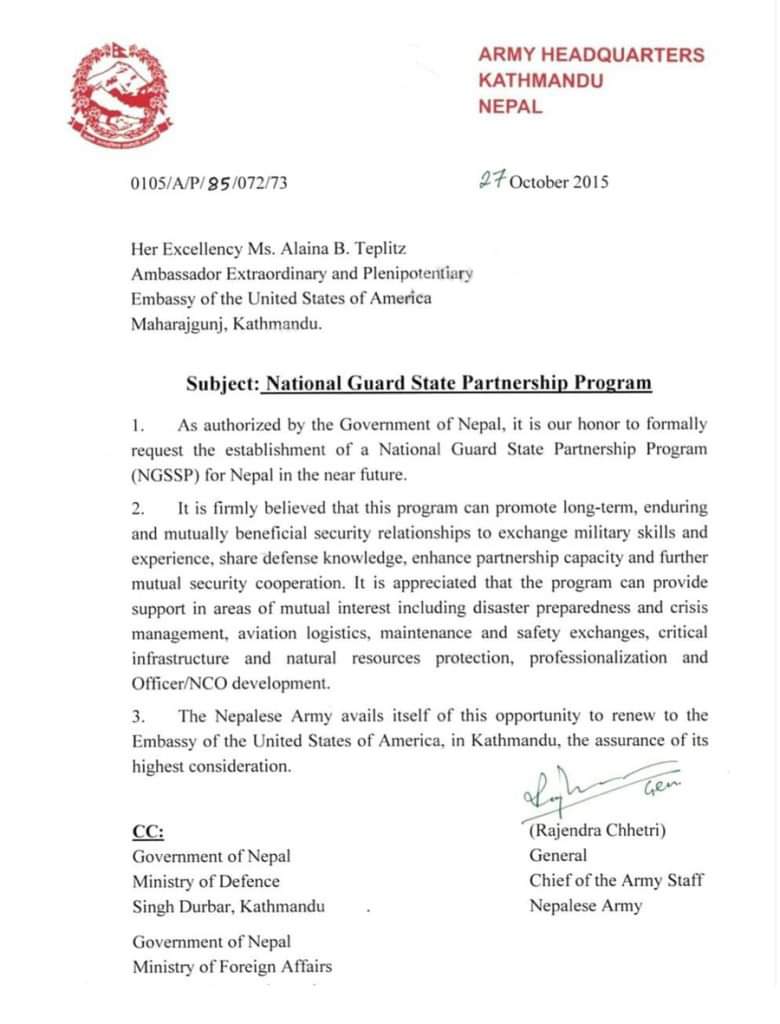 काठमाडौं। सैन्य साझेदारीसम्बन्धी अमेरिकाको स्टेट पार्टनरसिप प्रोग्राम एसपीपीमा सहभागी हुन नेपाली सेनाले ७ वर्ष अघि नै पत्र पठाएको खुलासा भएको छ । सरकारको स्वीकृती लिएर एसपीपीमा सहभागी हुन सेनाबाट पत्राचार भएको खुलेको हो ।