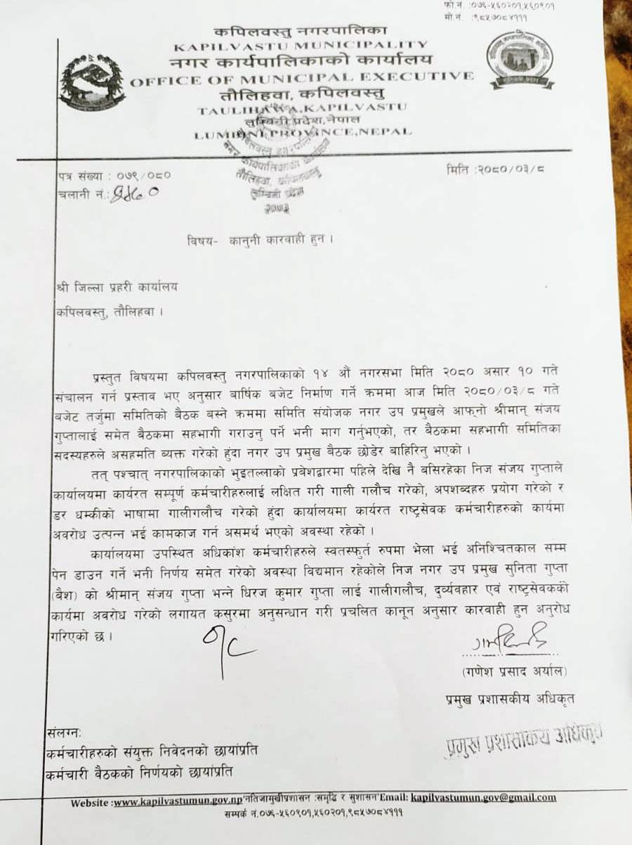 उप मेयर सुनिता गुप्ताका श्रीमान संजय भन्ने धिरज गुप्ताले प्रमुख प्रशाकीय अधिकृत सहीत कर्मचारीहरुलाई गाली गलौच गरी दुब्र्यवहार समेत गरेको भन्दै कपिलवस्तु नगरपालिकाका कर्मचारीहरुले शुक्रवार दिउसो देखि पेन डाउन गरी बिरोध प्रर्दशन उत्रेका छन । असार १० गते नगरको नीति तथा कार्यक्रमकालागि सभा हुने मिति तय गरिएको छ । नगर सभा कै पुर्व सन्ध्यामा कर्मचारीहरुले गरेको पेन डाउनले कामकाज प्रभावति हुने देखिएको छ ।