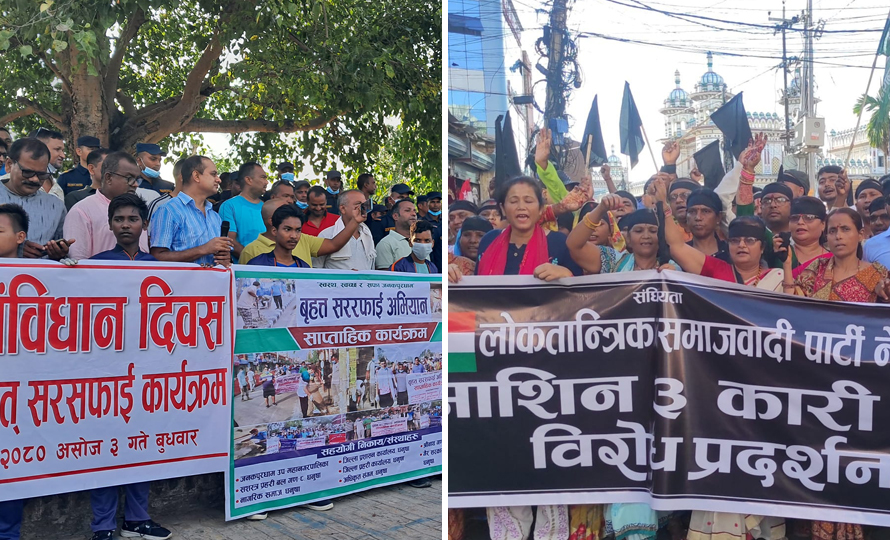 संविधान दिवसमा एमालेले आयोजना गरेको सरसफाइ कार्यक्रम र लोकतान्त्रिक समाजवादी पार्टीले गरेको विरोध प्रदर्शन ।