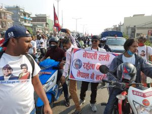राजसंस्था पुनःस्थापनको माग गर्दै सोमबार रुपन्देहीमा र्‍याली प्रदर्शन गरिएको छ । वीर गोर्खाली अभियानको आयोजनामा ‘देश र श्रीपेचको रक्षा’ कोे लागि भन्दै रूपन्देहीमा मोटरसाइकल र्‍यालीसहित प्रदर्शन भएको हो ।राष्ट्रिय झण्डा र पूर्व राजा-रानी ज्ञानेन्द्र-कोमल शाहको तस्वीर अंकित टिसर्ट लगाएर तिलोत्तमाको मणिग्रामबाट बुटवलको ट्राफिक चोकसम्म र्‍याली निकालिएको हो ।