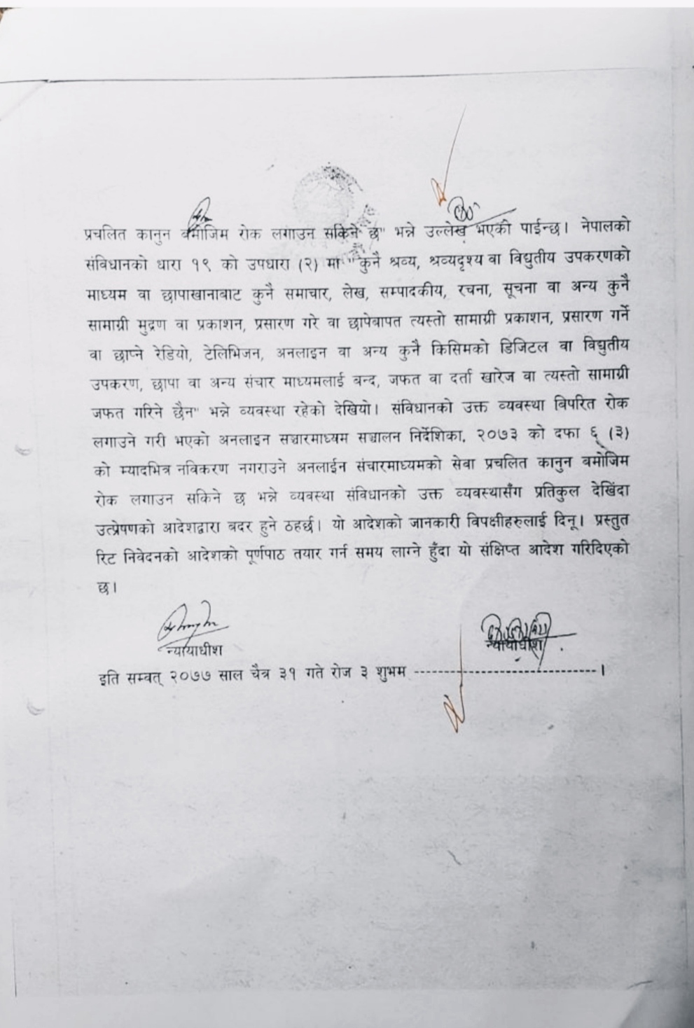 सबोच्च अदालतका न्यायाधिशहरु दीपककुमार कार्की र शुष्मालता माथेमाको इजलासले नेपालको संविधान २०७२ को धारा १९ (२) मा रहेको कुनै श्रव्य, श्रव्यदृश्य वा विद्युतीय उपकरणको माध्यम वा छापाखानाबाट कुनै समाचार, लेख, सम्पादकीय, रचना, सूचना वा अन्य कुनै सामग्री मुद्रण वा प्रकाशन, प्रसारण गरे वा छापे बापत त्यस्तो सामग्री प्रकाशन, प्रसारण गर्ने वा छाप्ने रेडियो, टेलिभिजन, अनलाइन वा अन्य कुनै किसिमको डिजिटल वा विद्युतीय उपकरण, छापा वा अन्य सञ्चार माध्यमलाई बन्द, जफत वा दर्ता खारेज वा त्यस्तो सामग्री जफत गरिने छैन भन्ने ब्यवस्था विपरित अनलाइनलाई रोक लगाउने गरी भएको अनलाइन संचारमाध्यम संचालन निर्देशिका २०७३ को दफा ६ (३) को ब्यवस्थालाई खारेज गर्ने आदेश दिएको हो ।
