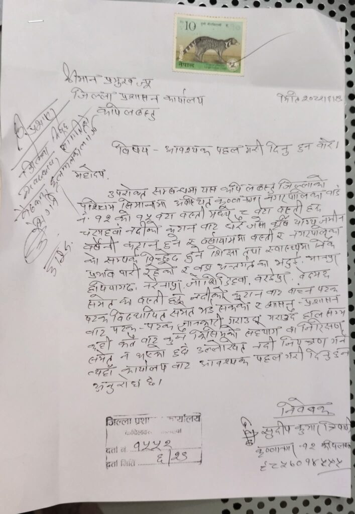 कपिलवस्तु , असाेज २९ । जिल्लाकाे कृष्णनगरका स्थानीय युवाहरुले चरंगाहवा नदी काट्न नियन्त्रणका लागि पहल गरिदिन जिल्ला प्रशासन कार्यालयलाई अनुराेध गरेका छन ।