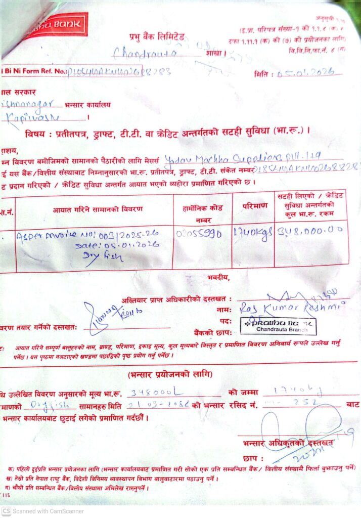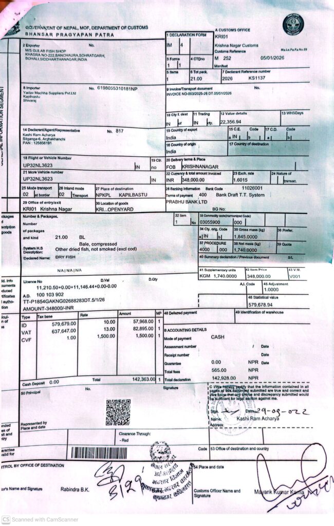 पुस २१ गते राति लगभग १० बजे भन्सार कार्यालय कृष्णनगरबाट छुटेकाे सिध्रा माछा लाेड गरेकाे युपी ३२ एनएल ३६२३ नम्बरकाे पिकअप गाडीकाे प्रज्ञापनपत्रमा देखाइएकाे ताैलभन्दा भन्दा बढी वजन मालसामान लगिरहेकाे बिशेष सुचनाका आधारमा नेपाल प्रहरीद्वारा पुनः ताैल गराइयाे । वाणगंगा यातायात व्यवसायी समिति कपिलवस्तुमा ताैल गर्दा गाडीभारसहित सिध्रा ४०१० केजी देखियाे जुन भन्सारमा देखाइएकाे ताैल बारबर छ । प्रहरीले ताैल गराइसकेपछि मालधनीले नेपाली पिकअप गाडी नम्बर लु१ च ९२७९ मा पुन: लाेड गर्ने बेला नै कपिलवस्तु कै प्रहरी टाेलीले फेरि समातेर राजस्व अनुसन्धान कार्यालय बुटवल पठायाे । कुल १७२० केजी सिध्रा लाेड भएकाेमा भन्सार १७४० केजीकाे गराइयाे तर पनि पुन: ताैल गरिसकेकाे गाडी राजस्व अनुसन्धान कार्यालय पठाउने कारण के हाे ? मालधनीले प्रश्न तेर्साएका छन । यादव माछा फर्मका प्राेपराइटरका अनुसार कच्चापदार्थमा १०-२० केजीकाे फरकलाई सामान्य मानिन्छ तर सुराकी काे आधारमै दूई पटक जाँच ताैल गरेपनि मालसमान राजस्व अनुसन्धान कार्यालय पठाउनु र कार्यलयले निसर्त छाेड्नु प्रहरीकाे सुचकले मिसगाइड गरेकाे सराेकारवाला सबैकाे निष्कर्ष छ । सुचना गलत भएकाले उठाउनु परिरहेकाे जाेखिमले मालसामान आयात गर्ने व्यापारीहरु अहिले सशंकित बनेका छन । मालसमान भन्सार कार्यालयबाट प्रज्ञापन भईसकेपछि बीचमा ताैल चेकजाँच गर्ने क्रम केही महिनादेखि बढेकाे छ। जसमा राजस्व गस्ताीकाे जिम्मा पाएकाे सशस्त्र प्रहरी बल भन्दा नेपाल प्रहरी बढी छ । कतिपय आयात गरिएका मालसामानमा प्रज्ञापनकाे ताैल र वास्तविक ताैलमा सामान्य अन्तरमात्र हुँदै आएकाे छ ।पिडितका कागजहरु :