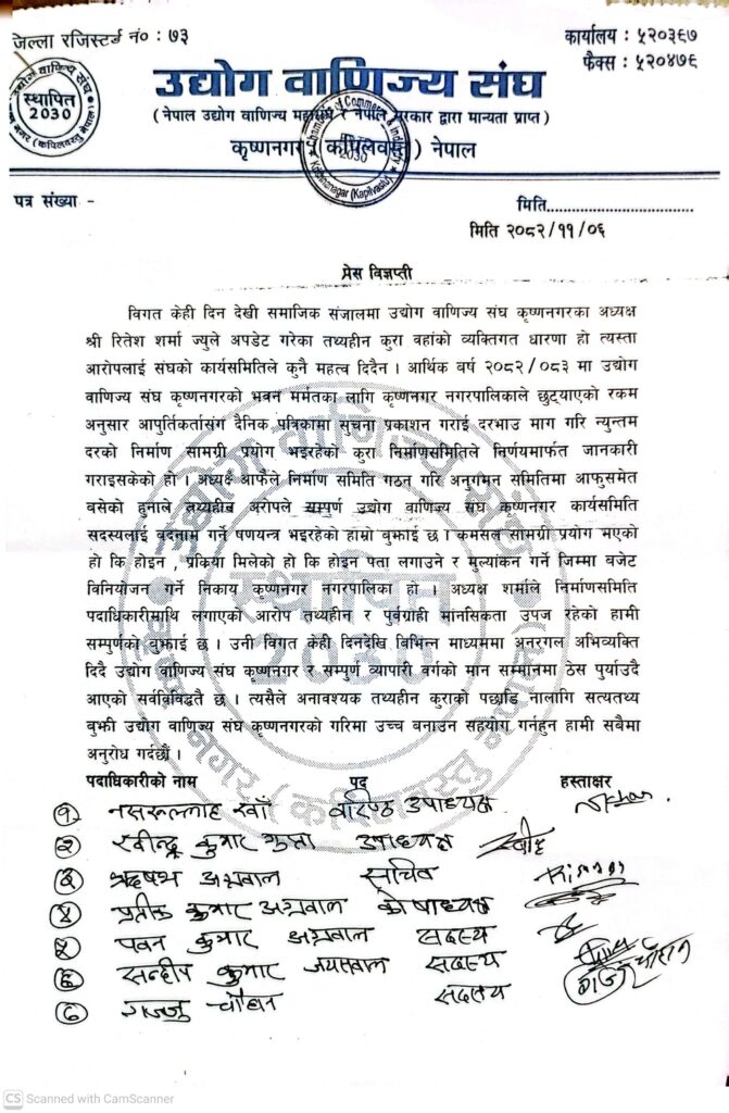 विगत केहीदेखि उधाेग बाणिज्य संघ कृष्णनगरकाे भवन मर्मतमा कमसल सामग्री प्रयाेग गरियाे भनि संघका अध्यक्ष रितेश शर्माले समाजिक संजालमा भिडियाेसहित भ्रष्टाचार भएकाे स्टेट्स लेखेपछि अन्य पदाधिकारीहरुद्वारा तिनकाे विरुद्ध प्रेस विज्ञप्ति जारी गरिएकाे हाे ।
