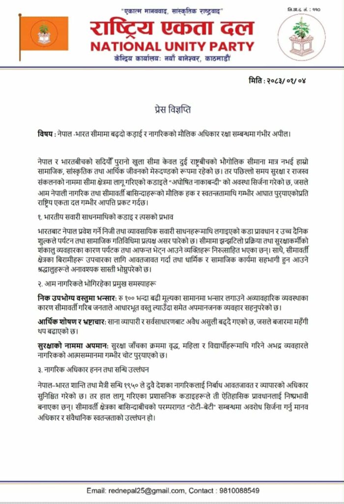नेपाल–भारत सीमामा कडाइ बढ्दा नागरिक अधिकार प्रभावित : राष्ट्रिय एकता दलको गम्भीर आपत्ति