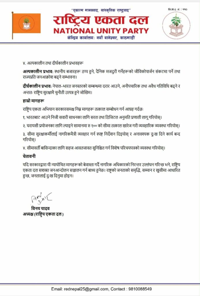 राष्ट्रिय एकता दलले सरकारसँग चार बुँदे माग अघि सारेको छ, जसमा—भारतीय सवारी साधनका लागि सरल डिजिटल अनुमति प्रणाली,घरायसी प्रयोजनका सामानमा भन्सार सीमा हटाउने,