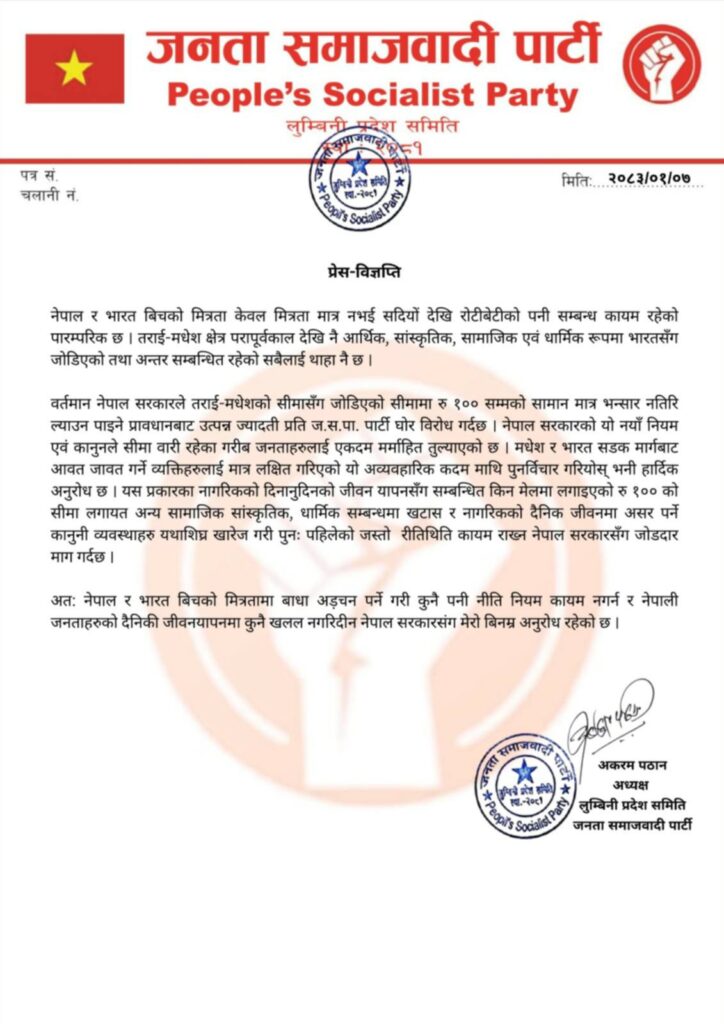 जनता समाजवादी पार्टीका लुम्बिनी प्रदेश अध्यक्ष अकरम पठानले तराईमा १०० रुपैयाँ भन्दामाथिकाे घरायसी समानमा भन्सार गर्ने प्रवधान तुरुन्त खारेज गर्नुपर्ने माग गर्नुभएकाे छ । उनले नेपाल- भारत सम्बन्ध राेटीबेटीकाे मात्र नभई समाजिक आर्थिक लगायतका पक्षमा पनि मजबुत छन तर यस्ता नियमले दुवै देशकाे जनभावना विपरीत रहेकाे विज्ञप्तिमार्फत ध्यानाकर्षण गराउनुभएकाे छ।