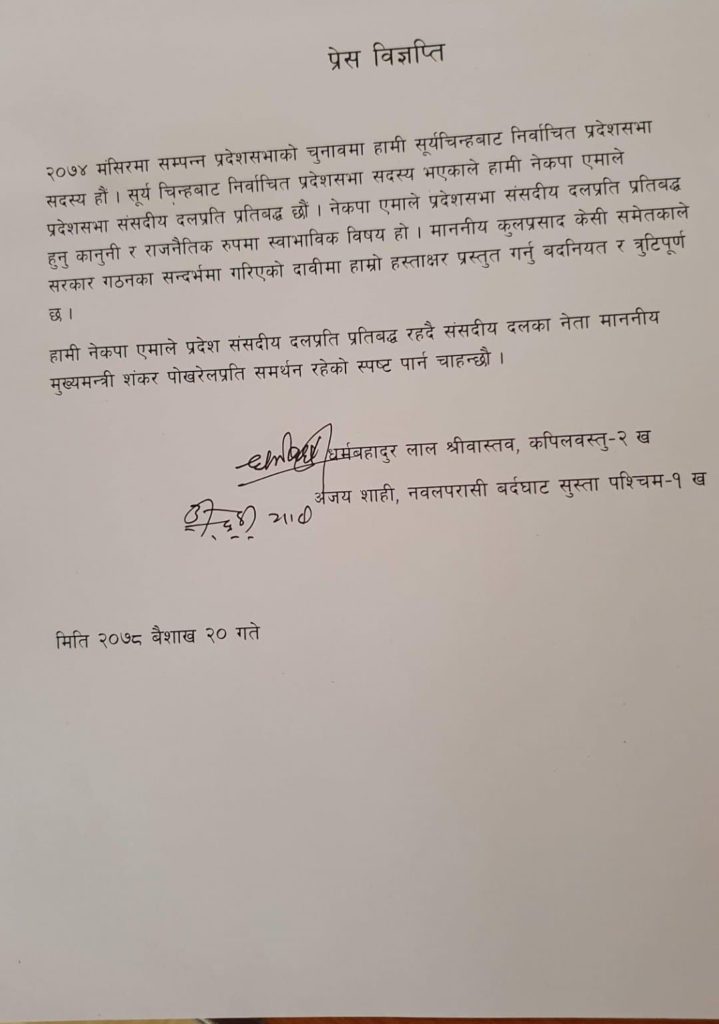 कपिलबस्तु-२ ‘ख’ बाट निर्वाचित धर्मवहादुर लाल श्रीवास्तव र नवलपरासीपश्चिम १ ‘ख’ बाट निर्वाचित अजय शाहीले सोमवार विज्ञप्तिमार्फत आफूहरुको समर्थन मुख्यमन्त्री शंकर पोखरेललाई रहेको प्रष्ट पारेका छन् ।