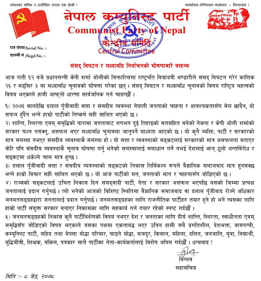 काठमाडौं । विप्लव नेतृत्वको नेपाल कम्युनिष्ट पार्टीले झण्डै दुईतिहाइ जनमतसहित बनेको नेकपा र केपी शर्मा ओली नेतृत्वको सरकार असफल भएकै कारण संसद विघटन भएको बताएको छ । यो कुनै व्यक्ति, पार्टी र सरकारको मात्र समस्या नभएरै संसदीय व्यवस्थाकै समस्या भएको विप्लव नेकपाको ठहर छ ।