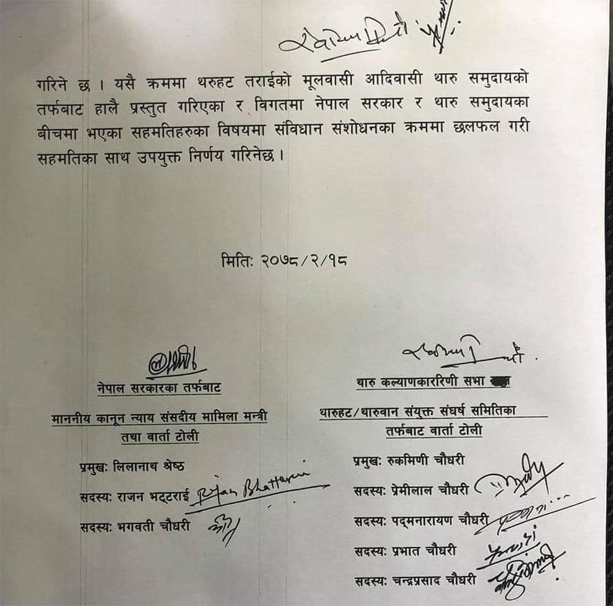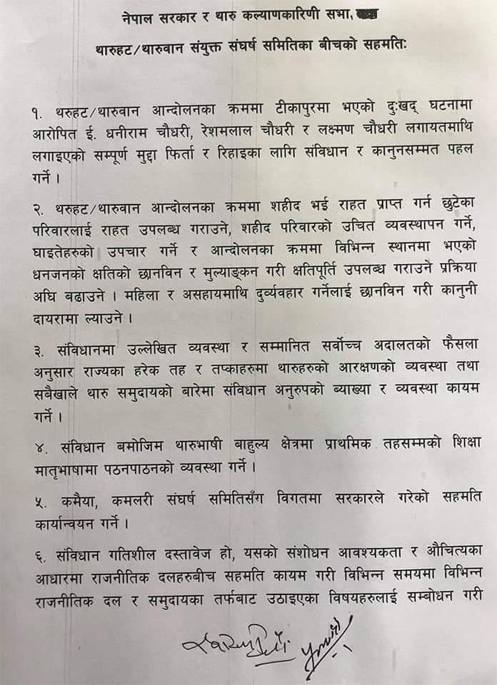 काठमाडौं , जेठ १८ । सरकार र आन्दोलनरत थारु कल्याणकारिणी सभाबीच ६ बुँदे सहमति भएको छ ।