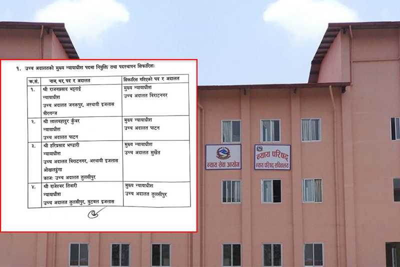 काठमाडौं : उच्च अदालतमा ४ मुख्य न्यायाधीश नियुक्तिका लागि सिफारिस गरिएको छ। उच्च अदालत जनकपुर अस्थायी इजलास वीरगञ्जका न्यायाधीश राजनप्रसाद भट्टराई, उच्च अदालत पाटनका न्यायाधीश हरिप्रसाद भण्डारी, उच्च अदालत विराटनगर अस्थायी इजलास ओखलढुंगाका न्यायाधीश हरिप्रसाद प्रसाद…