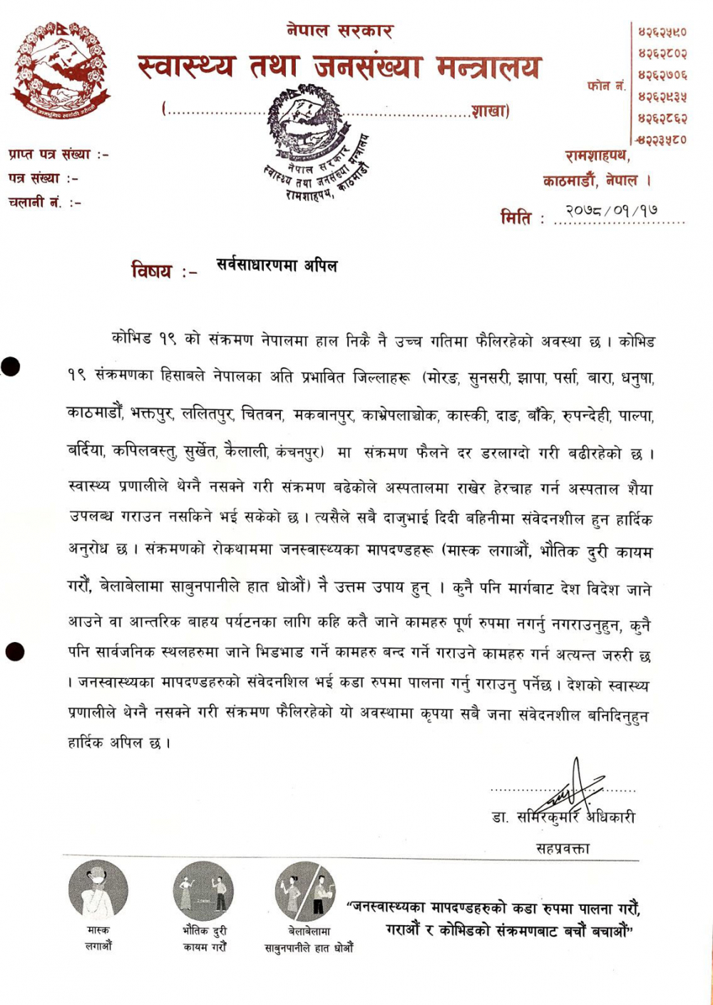 ‘स्वास्थ्य प्रणालीले थेग्नै नसक्ने अवस्था आयो’ काठमाडौँ — कोभिड १९ को संक्रमण नेपालमा निकै उच्च गतिमा फैलिरहेको बताउँदै स्वास्थ्य तथा जनसंख्या मन्त्रालयले स्वास्थ्य प्रणालीले थेग्नै नसक्ने अवस्था आएको बताएको छ । मन्त्रालयले शुक्रबार सार्वजनिक अपील जारी…