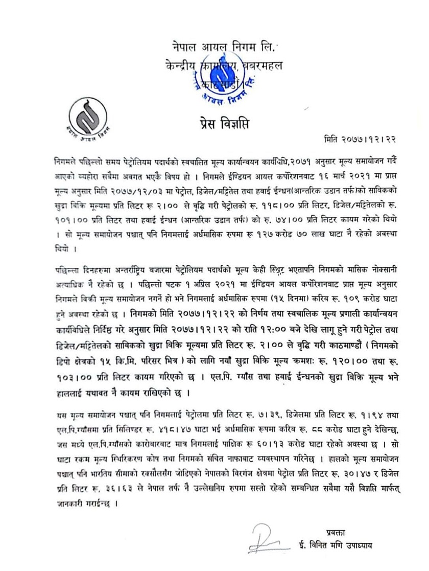 काठमाडौं । किसानलाई आवश्यक पर्ने वेला मै नेपाल आयल निगमले पेट्रोलियम पदार्थको मूल्य वृद्धि गरेको छ । निगमले मंगलबार राति १२ बजेबाट लागू हुनेगरी पेट्रोल, डिजेल र मट्टितेलमा २ रुपैयाँ प्रतिलिटर मूल्य वृद्धि गरेको हो। योसँगै…