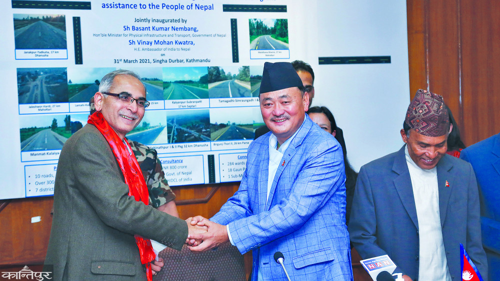 [caption id="attachment_8573" align="aligncenter" width="1000"] सडक हस्तान्तरण कार्यक्रममा भौतिक पूर्वाधार तथा यातायातमन्त्री वसन्तकुमार नेम्वाङ (दायाँ) र नेपालका लागि भारतीय राजदूत विनयमोहन क्वात्रा । तस्बिर :कान्तिपुर[/caption] काठमाडौं । भारतको ८ अर्ब र नेपाल सरकारको ५१ करोड रूपैयाँ लगानी…
