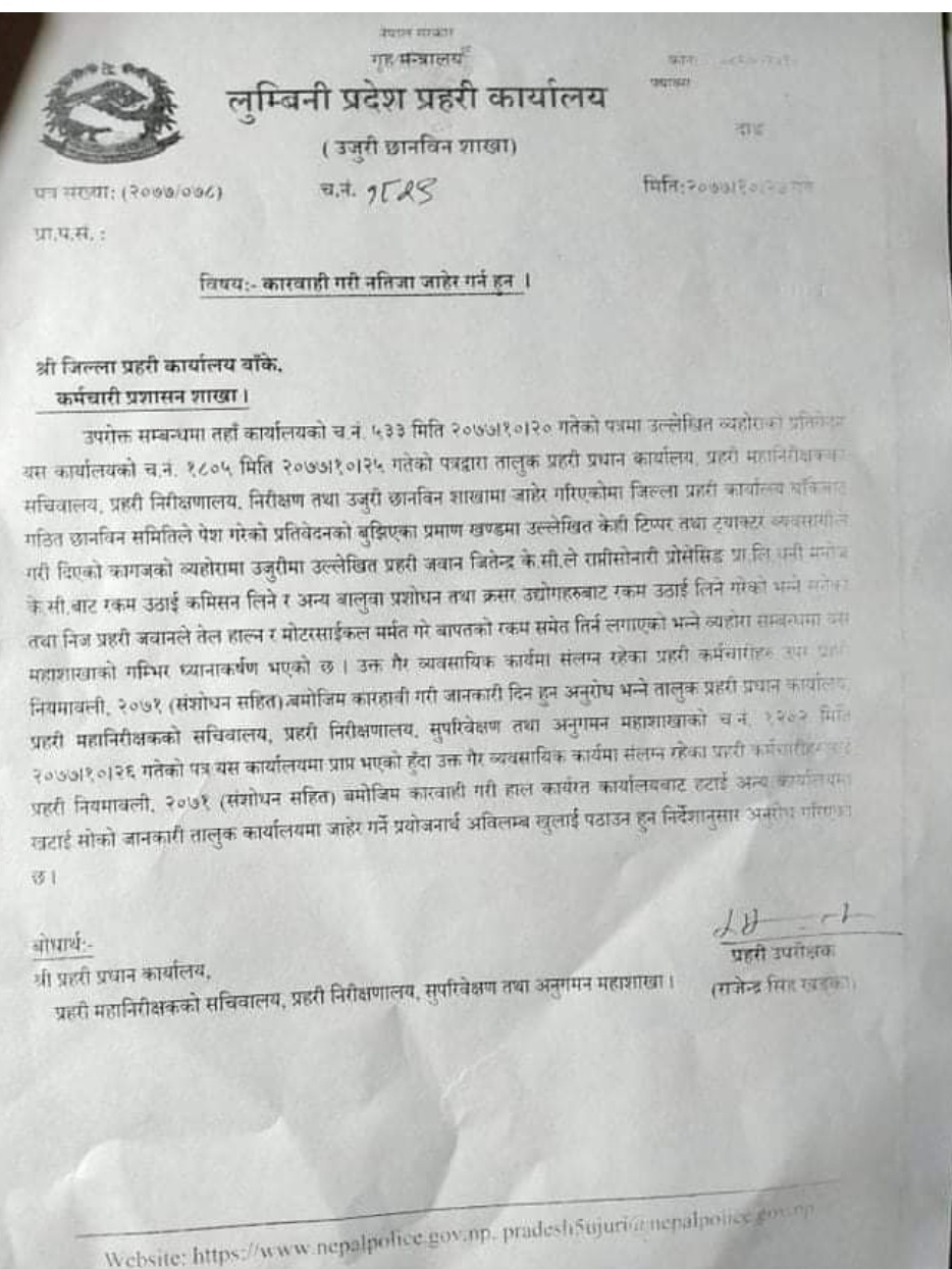 बाँके चैत १ गते । इलाका प्रहरी कार्यालय कोहलपुरमा कार्यरत घुमुवा प्रहरी जितेन्द्रजंग केसी असुलीधन्दामा लागेको खुलेको छ । राप्तीसोनारीका क्रसर ठेकेदार मनोज केसीबाट मोटो रकम असुली गर्दै मोटरसाईकलमा तेल हाल्नका लागि थप समेत असुल्दै आएको…