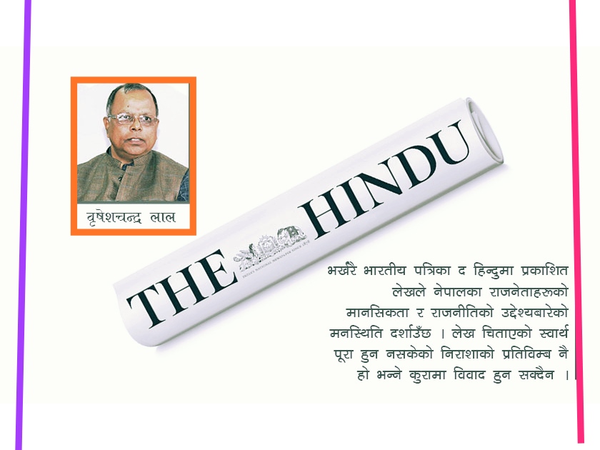 "द हिन्दूमा प्रकाशित लेख राजनेताहरूको मानसिकता र राजनीतिको उद्देश्यबारेको मनस्थिति दर्शाउँछ ।" नेपालमा राजनीतिक सङ्कट गहिरिँदै गर्दा देशका स्वनामधन्य नेताहरू आफ्नो दृष्टि दक्षिणी छिमेकी भारततिर तेस्र्याएका छन् । सामान्यदेखि ठूला समस्या वा घटना–परिघटना देखिने बितिक्कै खोक्रो…