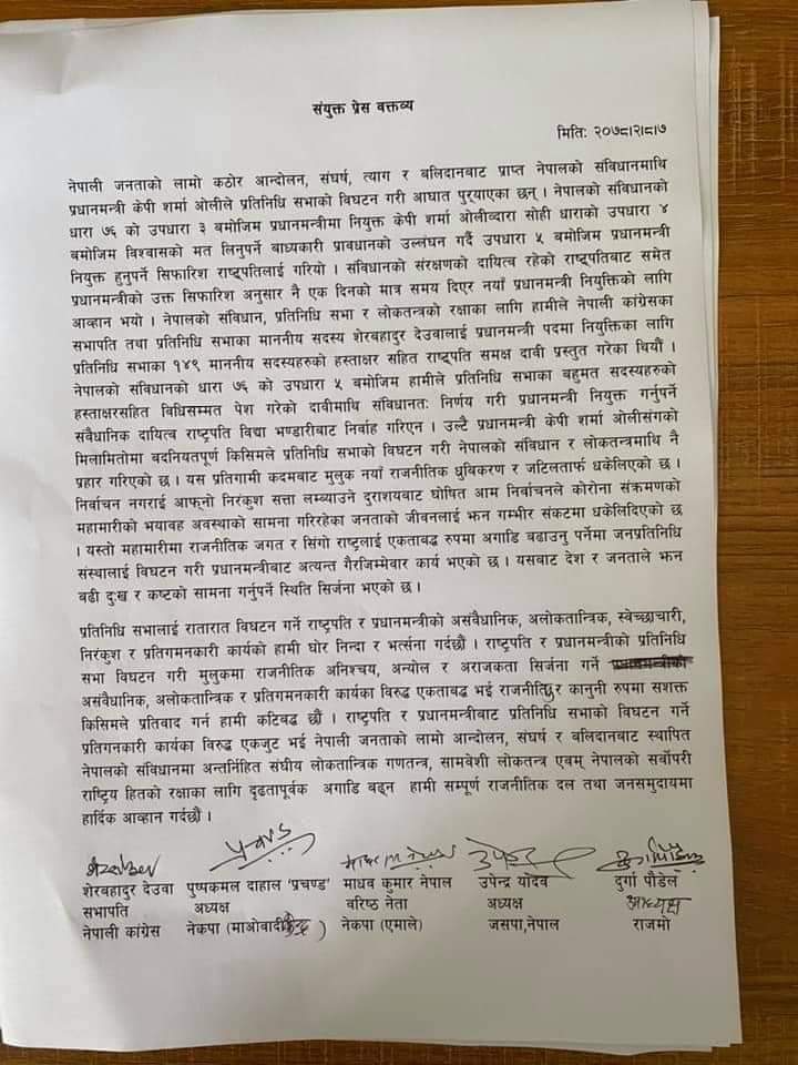 काठमाडौं , जेठ ८ । संसद विघटन र मध्यावधि निर्वाचन घोषणा गर्ने राष्ट्रपति विद्यादेवी भण्डारी र प्रधानमन्त्री केपी ओलीको कदम असंवैधानिक, अलोकतान्त्रिक, स्वेच्छाचारी, निरंकुश र प्रतिगमनकारी भएको निस्कर्ष निकाली विपक्षी पाँच दलको गठबन्धनले निर्वाचन बहिष्कार गर्ने…