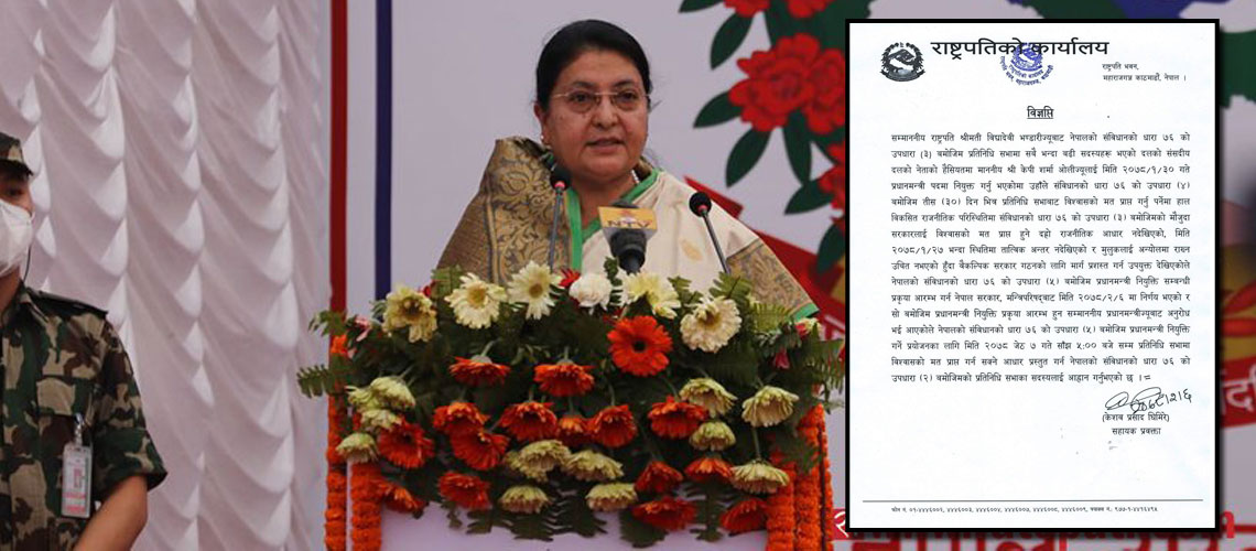 काठमाडौ । राष्ट्रपति विद्यादेवी भण्डारीले नयाँ सरकार गठनका लागि आह्वान गरेको विज्ञप्ति विहीबार राति ७ बजेर ५६ मिनेटमा राष्ट्रपति कार्यालयको वेबसाइटमा अपलोड भयो । यो आह्वान राति जारी भएकाले मात्र छापामार शैलीको गन्ध आएको होइन,दलहरूलाई तोकिएको…