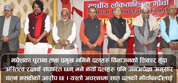 डाकमान राई काठमाडौँ : कहिले दलीय तथा मोर्चागत कारणले नजिकिने त कहिले टाढिने गरेका मधेशकेन्द्रित राजनीतिक दलहरू एकपटक फेरि हातेमालो गर्न जुटेका छन्। काठमाडौँमा बिहीबार एक कार्यक्रममार्फत मधेशकेन्द्रित सात राजनीतिक दलले ‘संघीय लोकतान्त्रिक मोर्चा’ घोषणा गरे।…