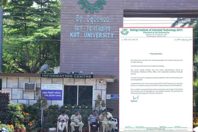 काठमाडौं : भारतको ओडिसा राज्यस्थित कलिंगा इन्स्टिच्यूट अफ् इन्डस्ट्रियल टेक्नोलोजी (केआईआईटी) का उच्च तहका प्रशासनिक अधिकारीसहित सुरक्षागार्ड निलम्बनमा परेका छन्। केआईआईटीले विज्ञप्ति जारी गर्दै दुईजना सुरक्षा कर्मचारीलाई बर्खास्त गरेको, दुई जना वरिष्ठ होस्टेल अधिकारी र अन्तर्राष्ट्रिय…