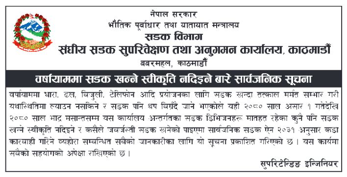 काठमाण्डाै - सरकारले आउँदो असार एक गतेदेखि भदौ मसान्तसम्म सडक खन्न रोक लगाएको छ । सङ्घीय सडक सुपरिवेक्षण तथा अनुगमन कार्यालयले बर्खायाममा सडक खन्न नदिने भएको हो । आज सार्वजनिक सूचना निकालेर सडक विभाग अन्तर्गतकाे कार्यालयले…