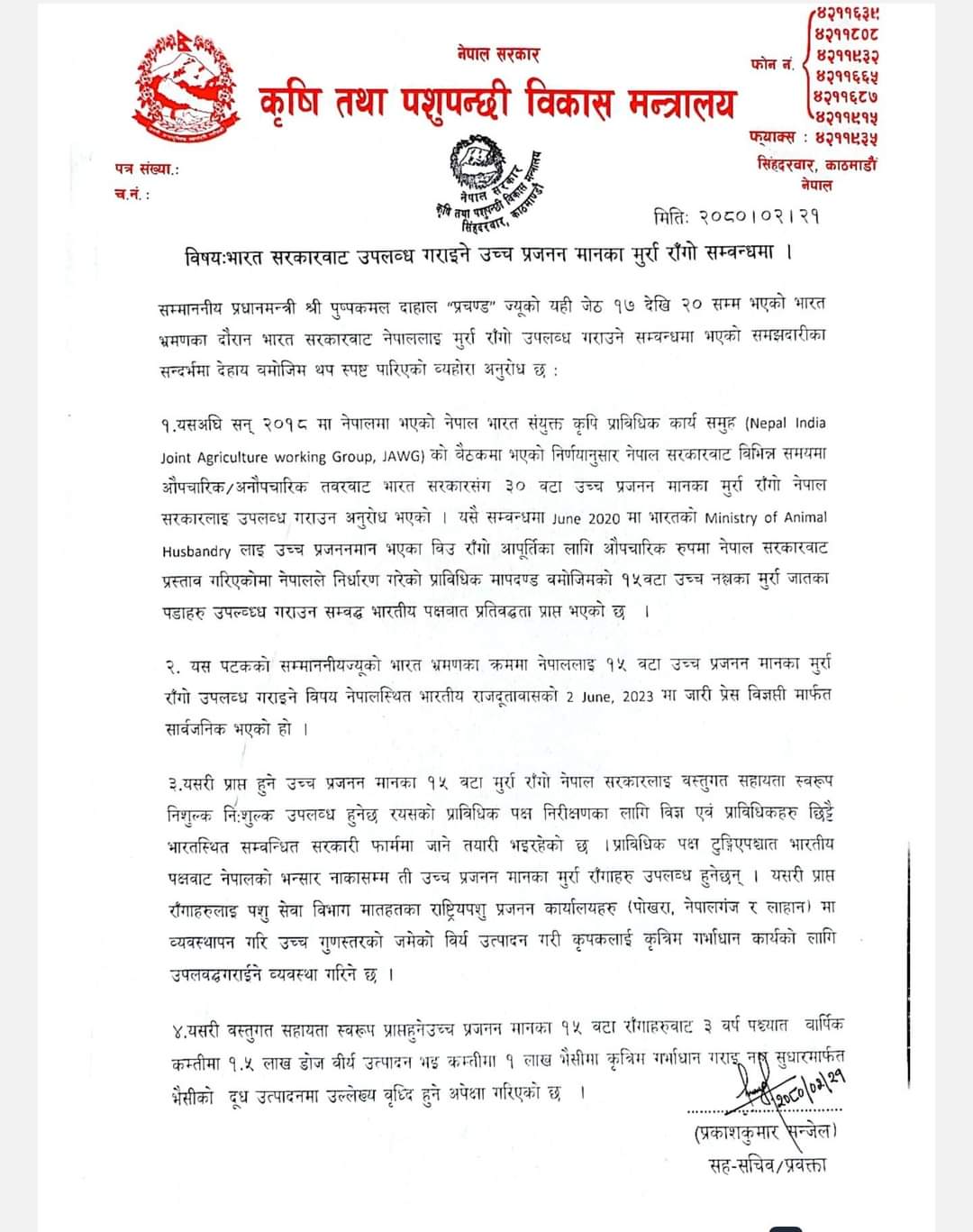 काठमाडौं। कृषि तथा पशुपन्छी विकास मन्त्रालयले नेपाललाई भारतले उपलब्ध गराउने १५ वटा मुर्रा जातको राँगाबाट कम्तीमा एक लाख भैँसीमा कृत्रिम गर्भाधान गराई नश्ल सुधार गरिने जनाएको छ। यसबाट भैँसीको दूध उत्पादनमा उल्लेख्य वृद्धि हुने मन्त्रालयको भनाइ…